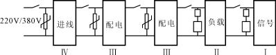 從圖1可以看出,在220V/380V線路中的每一區(qū)域,都應(yīng)該在其前面并聯(lián)氧化鋅壓敏電阻器或過電壓保護(hù)器,雷電感應(yīng)過電壓能量將通過逐級的防雷器件吸收和釋放到大地中,達(dá)到保護(hù)線路和設(shè)備免受雷電破壞的目的;雖然應(yīng)用于Ⅳ、Ⅲ區(qū)域的過電壓保護(hù)器具有自身劣化斷開電源的功能,但考慮到不同的接地狀況,還應(yīng)與過電壓保護(hù)器串聯(lián)合適的熔斷器或空氣開關(guān).