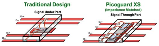 另一類是采用PicoGuard® XS技術的產品。這種類型設計使用阻抗匹配(Impedance Matched)電路,可保證100 Ω的阻抗,相當于電容為零。這類設計無需并聯電感,有助于最大限度地減少封裝引起的ESD電壓尖峰。