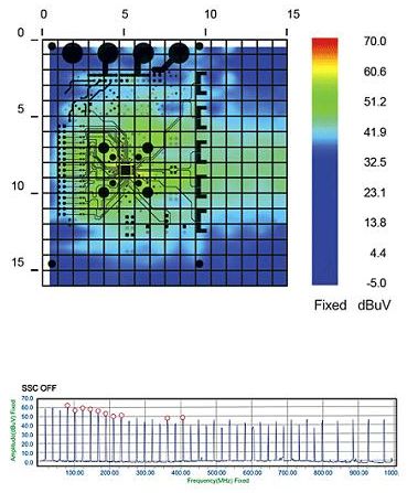 該公司期望用令人信服的量化證據來向汽車廠商說明SSCG功能可以有效降低EMI輻射。為了實現這個目標,設計團隊首先在SSCG功能為“關”的情況下將待測器件(DUT)放其內部掃描儀上,加電,然后在PC中捕獲輻射特性。為了進行有效的對比,在打開SSCG功能的情況下,對同一待測器件進行了掃描。