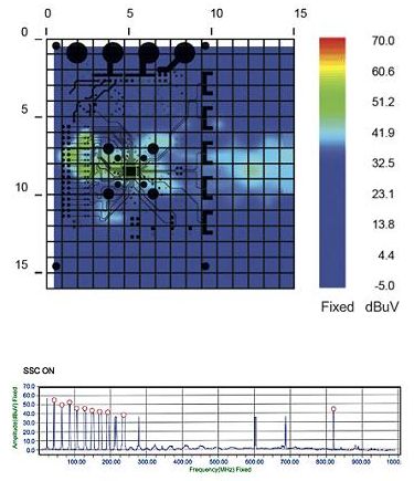 極近場掃描系統完成了空間和頻譜掃描后顯示并生成了以下輻射特性圖。需注意的是,掃描結果疊加在Gerber設計文件上,因此這樣對結果進行分析可以立即確定待測器件中的具體輻射體。圖2顯示了SSCG功能為“關”時待測器件的輻射特性。