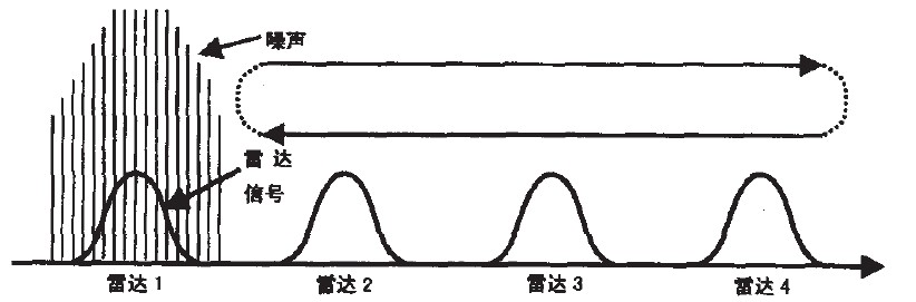 掃頻干擾方式主要在雷達的整個調諧頻帶內重復進行點干擾,雖然此方式不能比寬帶噪聲干擾給出更多的平均功率,但是掃頻干擾使每個雷達周期性地承擔最大可能的功率。事實證明,通過調整掃描頻率以保持雷達通帶內的干擾時間約等于雷達發射脈沖寬度,掃頻干擾方式在產生假目標方面是最有效的。并且對于掃描雷達,掃頻干擾可產生足夠可信賴的假目標。其工作方式如圖3所示。
