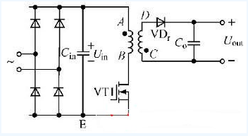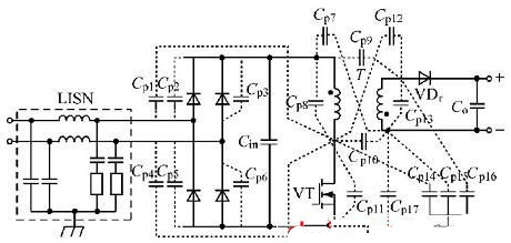 在圖1所示的反激式開關電源中,變換器工作于連續模式時,開關管VT導通后,B點電位低于A點,一次繞組匝間電容便會充電,充電電流由A流向B;VT關斷后,寄生電容反向充電,充電電流由B流向A。這樣,變壓器中便產生了差模傳導EMI。同時,電源元器件與大地之間的電位差也會產生高頻變化。由于元器件與大地、機殼之間存在著分布電容,便產生了在輸入端與大地、機殼所構成回路之間流動的共模傳導EMI電流。