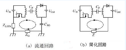 具體到變壓器中,一次繞組與二次繞組之間的電位差也會產生高頻變化,通過寄生電容的耦合,從而產生了在一次側與二次側之間流動的共模傳導EMI電流。交流等效回路及簡化等效回路如圖4所示。圖4中:ZLISN為線性阻抗穩定網絡的等效阻抗;CP為變壓器一次繞組與二次繞組間的寄生電容;ZG為大地不同點間的等效阻抗;CSG為輸出回路與地間的等效電容;Z為變壓器以外回路的等效阻抗。