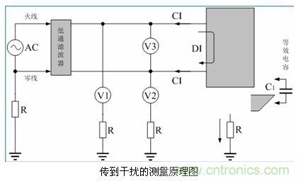 如圖所示,其中CI為共模干擾、DI為差模干擾、V1 = CI DI 、V2 = CI + DI 、V3 = DI ,R1、R2、R3、R4為接地電阻,C1為分布電容。