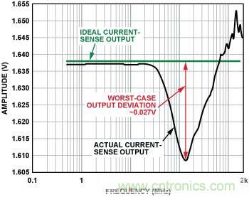 圖2. 電流傳感器輸出(無(wú)內(nèi)置EMI濾波器,前向功率 = 12 dBm, 100 mV/分頻,3 MHz時(shí)直流輸出達(dá)到峰值)