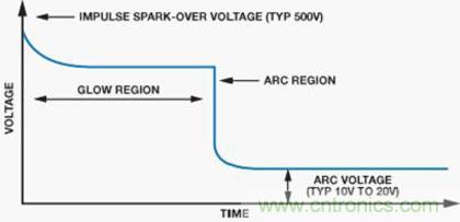 圖9顯示GDT的典型特性。當GDT兩端的電壓增大時,放電管中的氣體由于產生的電荷開始電離。這稱為輝光區。在此區域中,增加的電流將產生雪崩效應,將GDT轉換為虛擬短路,允許電流通過器件。在短路事件中,器件兩端產生的電壓稱為弧電壓。輝光區和電弧區之間的轉換時間主要取決于器件的物理特性。