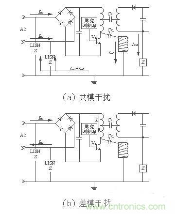 電源線噪聲是電網中各種用電設備產生的電磁騷擾沿著電源線傳播所造成的。電源線噪聲分為兩大類:共模干擾、差模干擾。共模干擾(Common-mode Interference)定義為任何載流導體與參考地之間的不希望有的電位差;差模干擾(Differential-mode Interference)定義為任何兩個載流導體之間的不希望有的電位差。兩種干擾的等效電路如圖2[1]所示。圖中CP1為變壓器初、次級之間的分布電容,CP2為開關電源與散熱器之間的分布電容(即開關管集電極與地之間的分布電容)。