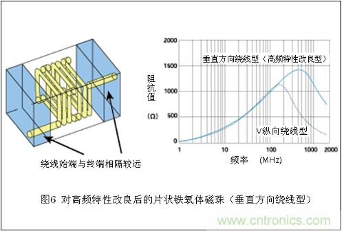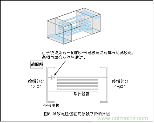 通過(guò)前記圖3中介紹的片狀鐵氧體磁珠阻抗頻率特性可以看出,阻抗值以 400-500MHz范圍為界開始減少。這是由于片狀磁珠的結(jié)構(gòu)所帶來(lái)的影響。一般來(lái)說(shuō),電感器的阻抗會(huì)隨著頻率的上升而逐步增大。然而,如圖5所示,普 通的片狀鐵氧體磁珠內(nèi)部在繞線始端(入口)和終端(出口)附近會(huì)存在相互較為接近的部位。由于這個(gè)部分會(huì)發(fā)生靜電耦合(存在一個(gè)微型電容的狀態(tài)),高頻電 流通過(guò)這里時(shí)會(huì)出現(xiàn)不容易受電感器阻抗影響的情況。由于頻率越高,靜電耦合部分越容易通過(guò),因此頻率越高所顯示的阻抗也就越低。
