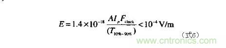 要想精確計算一個數字產品的輻射強度等級是件不現實的事情,因為有太多的因素會影響結果。下式表示了一個簡單的約束條件:開放的測量試驗場合,30MHZ以上,滿足FCC和VDE輻射限制的環路面積、峰值電流和上升時間。