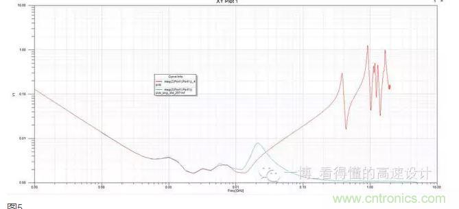 圖2是把電容安裝到一個6層板上面,層疊如左圖所示,4、5層是電源地平面對,右圖是安裝之后仿真的諧振頻率,大約是10M左右