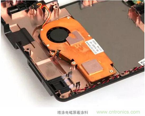 (2)在整個電子設備外殼就具有高電磁波發射能力的電路和器件周圍,添加電磁波屏蔽罩、粘貼金屬箔、噴涂導電涂料、鍍一層導電金屬層、增加電磁波吸收材料。