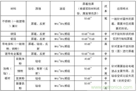 不銹鋼、銅箔、鋁箔、導電涂料、電磁波吸收材料(鐵氧體、鎳粉、碳黑、羰基鐵等)。