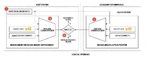 Maxim的DS28E15/22/25 IC基于SHA-256技術,擁有不同的內部存儲器容量。由于主機和設備側儲存有相同的密鑰,我們建議主機側使用協(xié)處理器,例如DS2465。