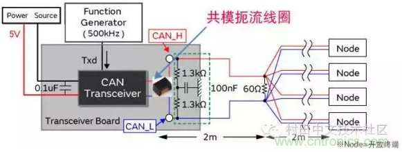 CAN要求通信質量有很高的可靠性,特別是對可靠性產(chǎn)生影響的電磁噪聲。為了電磁噪聲問題不對汽車內(nèi)部使用的無線通信等產(chǎn)生影響,除必須抑制噪聲的發(fā)生外,對于從周圍混入的噪聲,為保證通信質量,也要求要保持高度的耐性。例如,放射噪聲中,信號頻率250kHz(或500kHz)的高頻噪聲在高水平下能夠被放射到數(shù)十MHz帶域。