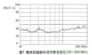 由測試結果可以看出,通過電磁兼容設計在傳導騷擾抑制方面取得了良好效果,在高頻段輻射騷擾的設計也達到了預期效果,下面還需對在30~200MHz頻段范圍內(nèi)的輻射騷擾進行改進設計。