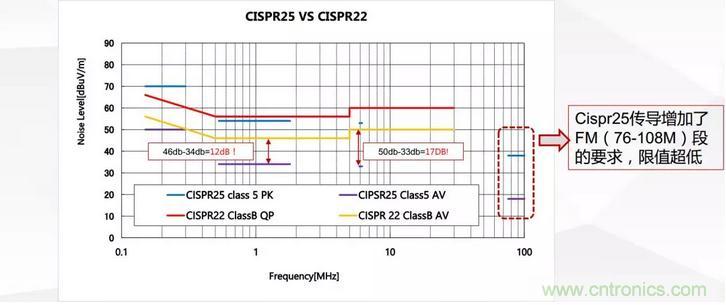 歷史上普遍接受的國(guó)際電磁干擾標(biāo)準(zhǔn)是CISPR-22,美國(guó)的電磁干擾標(biāo)準(zhǔn)是FCC,CISPR-22與FCC有所不同,但一般來說如果電源符合CISPR-22標(biāo)準(zhǔn),那么它也符合FCC標(biāo)準(zhǔn)??傊瓹ISPR-22標(biāo)準(zhǔn)已經(jīng)成為全世界都遵守的基本標(biāo)準(zhǔn)。汽車上的電磁干擾標(biāo)準(zhǔn)是CISPR-25,相對(duì)CISPR22來說CISPR-25標(biāo)準(zhǔn)限制值更低并且額外對(duì)FM頻段做了很嚴(yán)的限制要求。具體傳導(dǎo)測(cè)試限制要求如圖2所示。