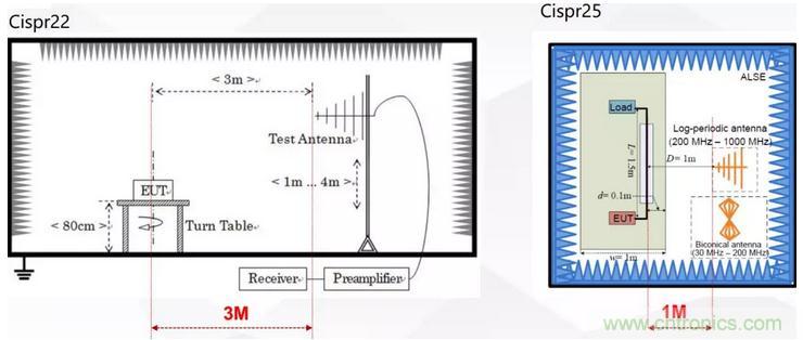 如圖3所示電磁干擾的輻射測(cè)試普遍采用天線接收法測(cè)試,相比于CISPR22來說CISPR25額外增加了150KHz ~ 30MHz的輻射測(cè)試,這部分測(cè)試頻段覆蓋了DCDC的工作頻率范圍,是輻射測(cè)試的難點(diǎn)。另外CISPR-25輻射測(cè)試采用1M法天線距離更近,測(cè)試接收的信號(hào)更強(qiáng)。