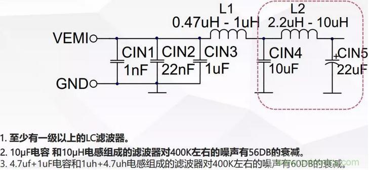 所有的LC濾波器都是以電感結(jié)束,并且要遠(yuǎn)離DCDC的高頻環(huán)路。防止電流環(huán)路的近場(chǎng)磁場(chǎng)效應(yīng)對(duì)輸入濾波器的影響。
