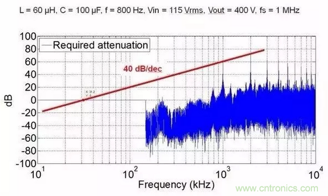我知道很多人會說,怎么可能,di/dt和dv/dt都大了,怎么可能EMI濾波體積還小了。我想說一句,共模和差模濾波器的沒有區(qū)別,相同的截止頻率下,高頻的衰減更大!就算你高頻下共模噪聲越大,但是你的記住,這個頻率下LC濾波器的衰減更大,想想幅頻曲線吧。為了說明這個結論,我給出一些定量分析結果。這些EMI分析均基于AC/DC三相整流,拓撲為維也納整流。我分別給出了1Mhz和500Khz的共模噪聲,可以看出,500khz共模濾波器需要的截止頻率為19.2kHz,1MHz為31.2kHz。