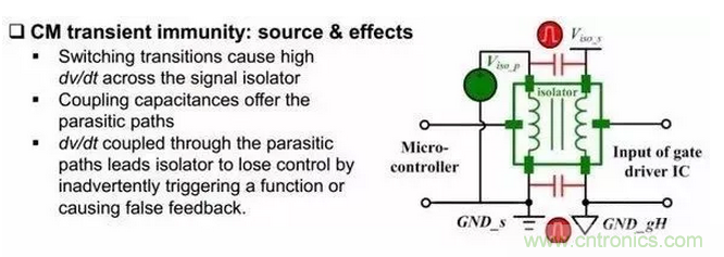 同時選隔離芯片的時候也需要注意一個參數(shù)叫做CM transient immunity(肯定會給的),這個參數(shù)最好大于開關瞬間,橋臂中點電平的變化速率。光耦隔離這個參數(shù)一般在30kV/us,磁耦在35kV/us,電容耦合在50kV/us(是不是絕望了,都比氮化鎵低,硅器件一般在10kV/us,Sic 30kV/us)。