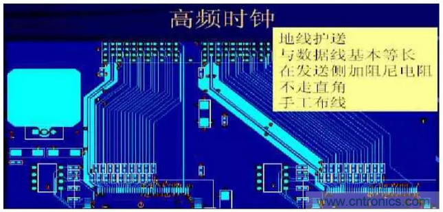 9、關鍵信號線(如時鐘線、總線、接口信號線、很射頻線、復位線、片選線)一般都是強輻射源或敏感信號線,盡可能靠近地平面布線,使其信號回路面積減少,減少其輻射強度或提高抗干擾能力。