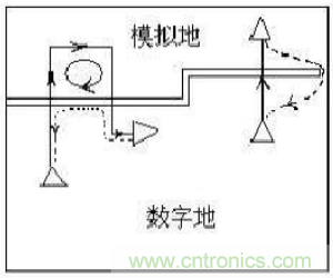 ⑨同時具有模擬和數字功能的電路板,模擬地和數字地的電源銅箔通常是分離的;兩種銅箔只在電源處連接。但是這種分離方式就存在一個問題:信號線必須穿越銅皮邊界線。這些邊界線迫使信號回流到器件前首先到達電源。解決的方法是在信號穿越的地線銅箔處放置跳線。這些跳線在分離的銅箔中為信號回路提供橋梁,有助于縮小電流環路。