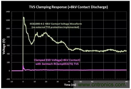 TVS Clamping Response ( 8kV Contact Discharge): TVS鉗位響應( 8kV接觸放電)8kV Contact voltage waveform: 8kV接觸電壓波形No external TVS protection implemented: 沒有使用外部TVS保護Clamped ESD voltage( 8kV contact) with Semtech RClamp0531TQ TVS: 使用Semtech RClamp0531TQ TVS的鉗位ESD電壓( 8kV接觸電壓)Time: 時間