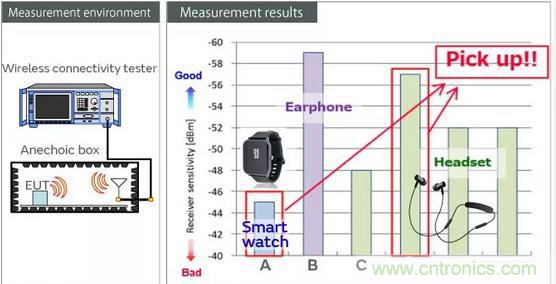 在許多內(nèi)部耳機(jī)干擾的情況下,設(shè)備內(nèi)的不需要的無(wú)線電波疊加在通信所需的信號(hào)之上,這會(huì)產(chǎn)生噪聲并導(dǎo)致音頻跳過(guò)。在這里,我們使用商業(yè)產(chǎn)品來(lái)測(cè)量2.4 GHz信號(hào)的最小接收電平,以驗(yàn)證由于設(shè)計(jì)對(duì)策而導(dǎo)致音頻跳過(guò)的可能性的差異,以防止藍(lán)牙設(shè)備內(nèi)的干擾。就內(nèi)部設(shè)備干擾而言,大圖值表示即使信號(hào)較弱也可以進(jìn)行通信,并且音頻不太可能跳過(guò)。