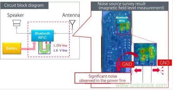 圖5顯示了用于測(cè)量的測(cè)量環(huán)境以及測(cè)量與藍(lán)牙天線耦合的噪聲的結(jié)果。觀察到極高水平的噪聲,這需要噪聲抑制以降低水平。實(shí)現(xiàn)藍(lán)牙噪聲抑制時(shí),有兩個(gè)關(guān)鍵的實(shí)現(xiàn)區(qū)域。