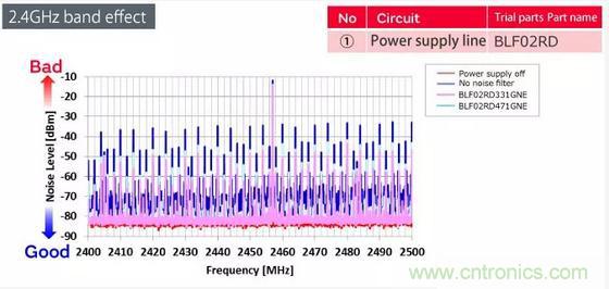 這些是在藍(lán)牙通信期間測(cè)量與天線耦合的噪聲頻譜的結(jié)果。將BLF02RD過(guò)濾器插入電源線。我們能夠?qū)⒄瓗г肼曁岣呒s5 dB,并驗(yàn)證BLF02RD濾波器是一種有效的解決方案。