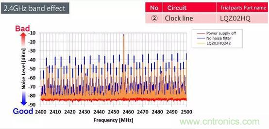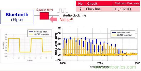 第一個(gè)區(qū)域是電源線,第二個(gè)區(qū)域是時(shí)鐘線。由于電源線由于切換而產(chǎn)生更高的諧波,并且時(shí)鐘信號(hào)的高次諧波延伸到2.4GHz頻帶,因此在藍(lán)牙信號(hào)中產(chǎn)生噪聲。濾波是抑制噪聲傳導(dǎo)的有效方法。