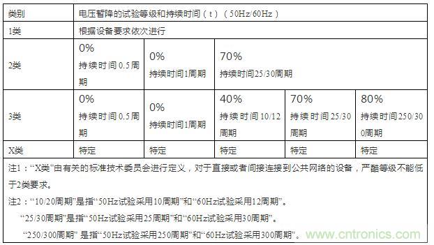 表1:電壓暫降試驗優先采用的試驗等級和持續時間