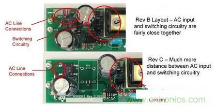 圖1:讓輸入布線與具有高 dV/dt 的節點靠得太近會增加傳導 EMI。