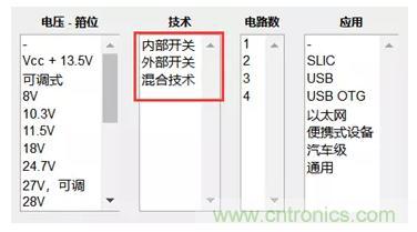 你可以訪問Digi-Key浪涌抑制IC,選擇相關的器件。Digi-Key網站提供豐富的參數選項供選擇,下圖中「外部開關」指的是器件外部需要另加開關(比如MOS管),而該芯片一般是起到控制作用。而「內部開關」指的是保護電路的開關在芯片的內部。