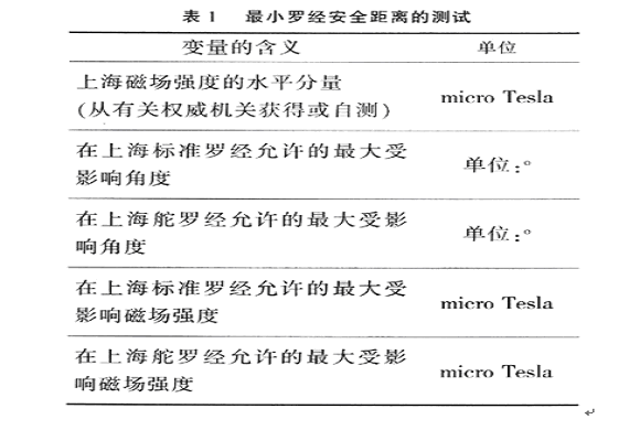 羅經最小安全距離的測試方法是利用地球磁場強度與角度的關系,將對角度的測量轉化為對磁場強度的測最。在上海地區的測試方法如表1所示。
