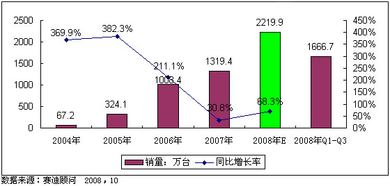 圖1 2004-2008年中國數(shù)字電視機(jī)頂盒市場銷售量及預(yù)測