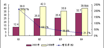 賽迪顧問數據顯示,2007年中國PND市場一路飆升,2008年仍保持了平穩快速增長,前三季度市場銷售量達到117.2萬臺,同比增長率為85.5%。盡管宏觀經濟環境低迷,進入第四季度PND傳統旺季,PND市場仍表現優異,銷量將超過第三季度實現環比增長。 圖1 2007~2008年中國PND市場銷售量對比
