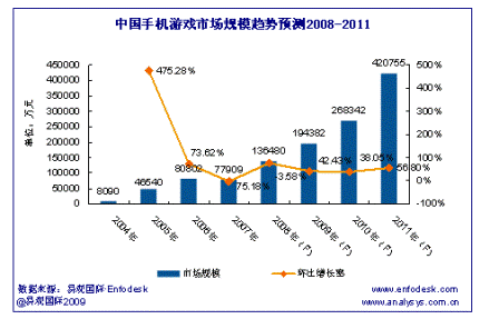 據(jù)易觀國(guó)際(Analysys International)最新報(bào)告《中國(guó)手機(jī)游戲市場(chǎng)趨勢(shì)預(yù)測(cè)2008-2011》研究結(jié)果顯示:2011年中國(guó)手機(jī)游戲(本文手機(jī)游戲范疇均為基于JAVA和BREW技術(shù)開(kāi)發(fā)的手機(jī)游戲)市場(chǎng)規(guī)模將達(dá)到42億元,從2003年到2011年的手機(jī)游戲市場(chǎng)規(guī)模年均復(fù)合增長(zhǎng)率為147.90%。其中移動(dòng)運(yùn)營(yíng)商收入從2003年到2011年年均復(fù)合增長(zhǎng)率將達(dá)143.26%,手機(jī)游戲SP收入從2003年到2011年年均復(fù)合增長(zhǎng)率將達(dá)348.01%。手機(jī)游戲SP高復(fù)合增長(zhǎng)率主要由自身對(duì)手機(jī)聯(lián)網(wǎng)游戲產(chǎn)品的推動(dòng)、用戶對(duì)休閑娛樂(lè)應(yīng)用需求的增長(zhǎng)、3G網(wǎng)絡(luò)商用等因素所帶動(dòng)。