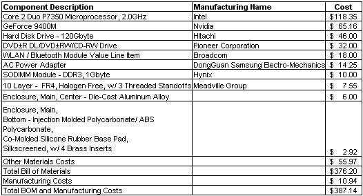 這種新一代Mac Mini的入門級版本的材料成本是376.20美元,如果計入制造成本,則總成本升至387.14美元。這種低端型號的Mac Mini價格是599美元,這表明與蘋果公司的iPod產品等低成本消費產品相比,其個人電腦的材料成本/制造利潤相對較低。