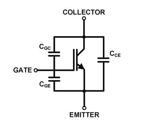 IGBT模塊的開關特性主要取決于半導體電容(電荷)及內部和外部的電阻。圖1是IGBT電容的示意圖,其中CGE是柵極-發射極電容、CCE是集電極-發射極電容、CGC是柵極-集電極電容(或稱為米勒電容)。
