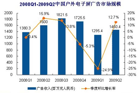 易觀國際分析認為,由于部分細分市場尚未走出宏觀經濟下滑的困境,加上整體市場的反彈并不強勁,因此本季度整體市場規模未達到去年同期的水平,預計目前中國宏觀經濟的好轉對戶外電子屏廣告市場的促進作用將在下半年顯現。