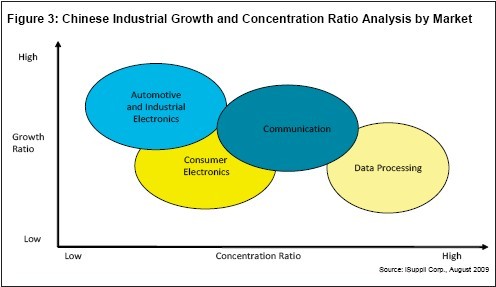 汽車與工業(yè)電子市場(chǎng)具有多樣化與分散化特點(diǎn)。但在中國(guó),未來(lái)五年內(nèi),這兩個(gè)領(lǐng)域?qū)⑹撬袘?yīng)用領(lǐng)域中增長(zhǎng)最快的。工業(yè)高速增長(zhǎng)和制造業(yè)集約化程度低,為分銷商提供了許多商業(yè)機(jī)會(huì)。圖3所示為iSuppli公司對(duì)中國(guó)工業(yè)增長(zhǎng)與集中程度的分析,按市場(chǎng)細(xì)分。