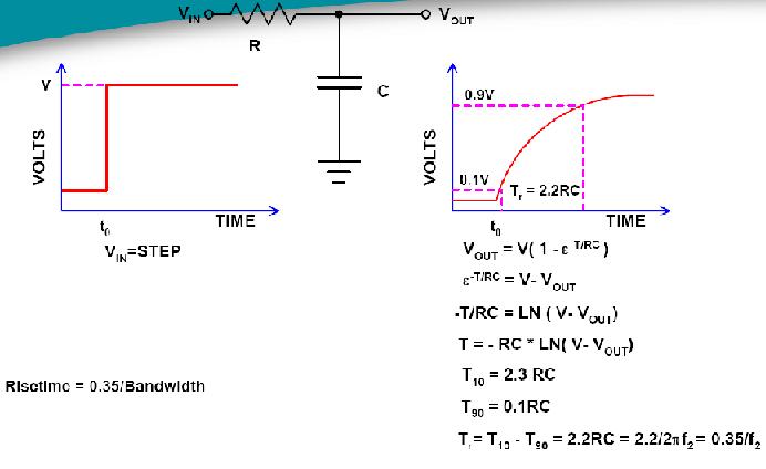 至此,我們知道帶寬f2即輸出電壓降低到輸入電壓70.7%時的頻率點。 根據放大器的等效模型,我們可進一步推導示波器的上升時間和帶寬的關系式,即我們常提到的0.35的關系:上升時間=0.35/帶寬,推導過程如下圖6所示。 需要說明的是,0.35是基于高斯響應的理論值,實際測量系統中這個數值往往介于0.35-0.45之間。在示波器的datasheet上都會標明“上升時間”指標。 示波器測量出來的上升時間與真實的上升時間之間存在下面的關系式。 在對快沿信號測試中,需要通過該關系式來修正實際被測信號的上升時間。