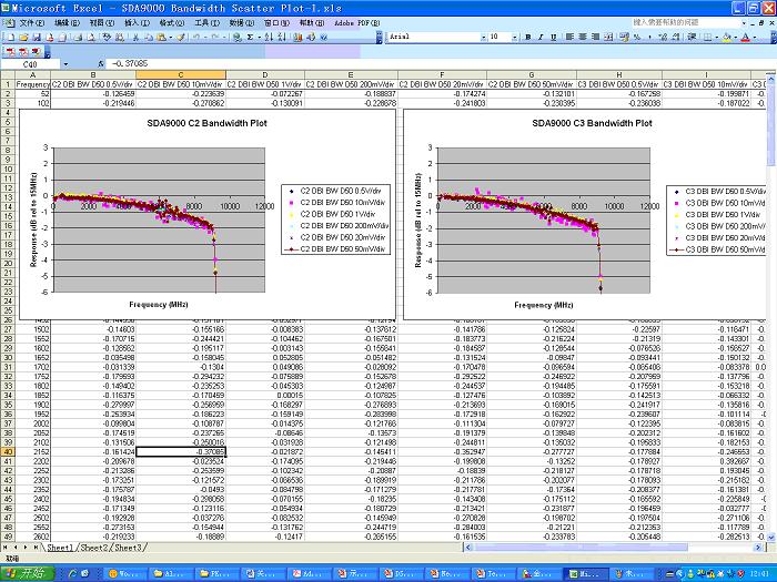 此外,在計量波特圖時需要對示波器每個檔位都進行計量,最終產生的波特圖是所有檔位的結果疊加在一起的。波特圖的計量是需要半天時間完成的,并不是想象中那么輕松的工作。如圖8所示是力科SDA9000的波特圖,我特地將Excel中大量數據顯示給大家以使大家對校準的嚴謹性有深刻認識。 其垂直軸是-1dB/div, 疊加了10mv/div、20mv/div、50mv/div、200mv/div、500mv/div、1v/div等檔位的測試結果。 很多時候,我們的競爭對手會把他們的波特圖畫成-10dB/div、只有一個檔位的測試結果拿給客戶,并和力科提供的這種-1dB/div、各種檔位疊在一起顯示的結果放在一起進行對比,然后他們告訴客戶,他們的波特圖更平坦,更干凈,甚至將力科波特圖上面密密麻麻的點說成是“噪音”大。這是有點貽笑天下的。 競爭對手敢于一再采用這種做法,這是假設中國的工程師都沒有辨別力,獨立思考能力,是對工程師嚴重不尊重的公然欺騙行為。希望能引起大家注意。