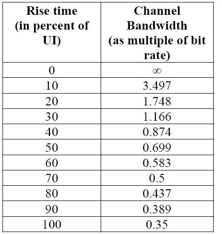 3, 對串行數據信號而言,數據比特率和上升時間是最重要的兩個因素。有一個非常好的評估準則是:示波器的帶寬 > 1.8 X 信號比特率. 在這個準則下,如果被測信號的上升時間>20%UI,那么1.8關系的帶寬能捕獲信號能量的99%. 下面的圖表給出了不同的上升時間和帶寬之間的關系。