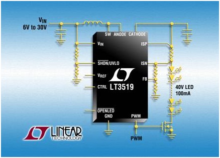 LT3519 在 LED 的高端檢測輸出電流,從而可實現降壓、降壓-升壓或升壓型配置。結合傳統電壓反饋和獨特的浮動電流檢測反饋,這些轉換器可以作為恒定電壓或恒定電流源工作,從而提供最大的設計靈活性。其它特點包括:開路 LED 保護、軟啟動和熱保護。
