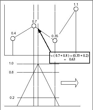 隨著窗口滑到右面,通過把窗口值之和乘以窗口和樣點相交時的實際樣點值,得到內插點。內插的樣點放在窗口頂點時間上。