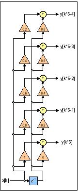 通過使用過采樣排列的數字濾波器,也可以實現這種卷積。圖中所示的排列是一個5點過采樣器。在這一排列中,每個新樣點都生成5個新樣點。濾波器輸出僅與新輸入和最后一個輸入有關。濾波系數通過對窗口采樣生成。