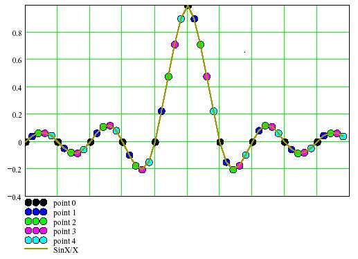 流行的、比較復雜的內插形式稱為SinX/X (也稱為Sync或簡稱為SinX內插)。SinX內插的名字來自于卷積使用的窗口函數眾所周知的形狀。與線性內插的窄尖三角不同,SinX內插窗口在理論上是一個從未結束的減幅正弦波。