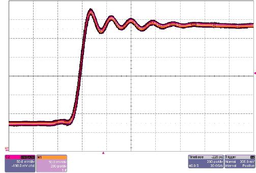 M1留在屏幕上作為參考,F1關閉,通道2上啟動SinX內插。示波器重復觸發,生成重復采集的波形及內插樣點的新余輝曲線。由于新余輝地圖在本質上是參考源的確切復現(幾乎看不到,位于余輝曲線的中心),測試結果表明,在這些情況下,適合使用SinX內插。同時,由于應用的邊沿非???,可以得出結論,在以20 GS/s最大采樣率運行時,WaveMaster 8620A將一直提供適當的SinX內插,而不管應用的輸入信號是什么。